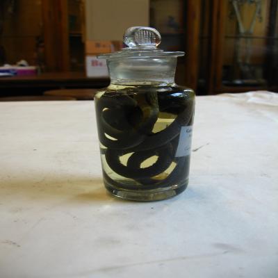 Podría corresponde a la pequeña colección de reptiles y algunos otros animales conservados en espíritu de vino (1861-62) o la colección de culebras (1862-63), ambas remitidas por Fernando Póo y regalado por el Sr. D. José Muñoz y Gaviria, Vizconde de San Javier.