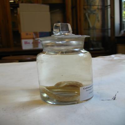 Podría corresponde a la pequeña colección de reptiles y algunos otros animales conservados en espíritu de vino (1861-62) o la colección de culebras (1862-63), ambas remitidas por Fernando Póo y regalado por el Sr. D. José Muñoz y Gaviria, Vizconde de San Javier.