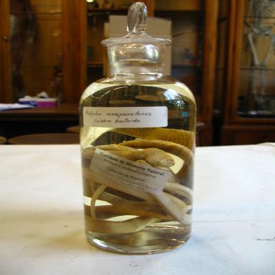 Podría corresponde a la pequeña colección de reptiles y algunos otros animales conservados en espíritu de vino (1861-62) o la colección de culebras (1862-63), ambas remitidas por Fernando Póo y regalado por el Sr. D. José Muñoz y Gaviria, Vizconde de San Javier.