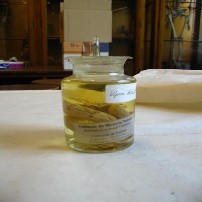 Podría corresponde a la pequeña colección de reptiles y algunos otros animales conservados en espíritu de vino (1861-62) o la colección de culebras (1862-63), ambas remitidas por Fernando Póo y regalado por el Sr. D. José Muñoz y Gaviria, Vizconde de San Javier.