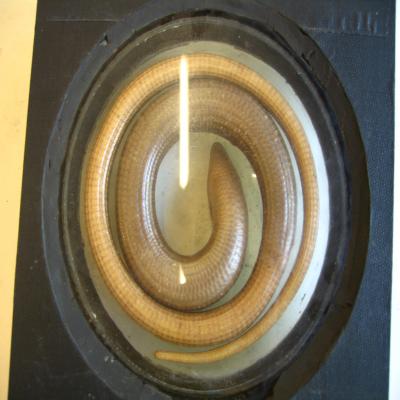 Expositor que muestra un ejemplar de lución enrrollado. Grande, cuerpo cilíndrico tipo ofidio. Cabeza alargada, apuntada, con escamas grandes. Cuerpo con varias filas de escamas medianas, iguales dorsal y ventralmente. Color parduzco.