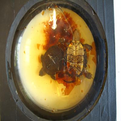 Expositor con dos ejemplares de galápagos. Tipo tortuga, con el caparazón aplanado. Cabeza algo ancha, apuntada, verde con puntitos amarillos. Extremidades algo aplanadas a modo de remo, adaptadas a la natación. Cola larguita, acabada en punta. Verde. Caparazón formado por placas grandes, verdes dorsalmente, con líneas amarillas, amarillas con manchas oscuras ventralemente.