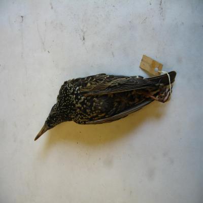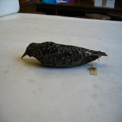 Un ejemplar disecado. Robusto, con pico largo y puntiagudo. Cabeza y cuerpo piriforme, alas puntiagudas y cola corta. Plumaje negruzco, lustrado de verde bronce y morado. Muy salpicado de blanco y con el pico oscuro (características de invierno). Patas fuertes pardo-rojizas.