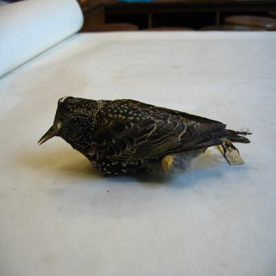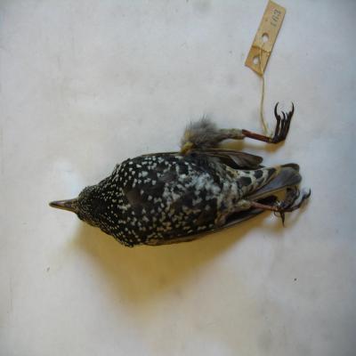 Un ejemplar disecado. Robusto, con pico largo y puntiagudo. Cabeza y cuerpo piriforme, alas puntiagudas y cola corta. Plumaje negruzco, lustrado de verde bronce y morado. Muy salpicado de blanco y con el pico oscuro (características de invierno). Patas fuertes pardo-rojizas. Tiene una pata casi desprendida.