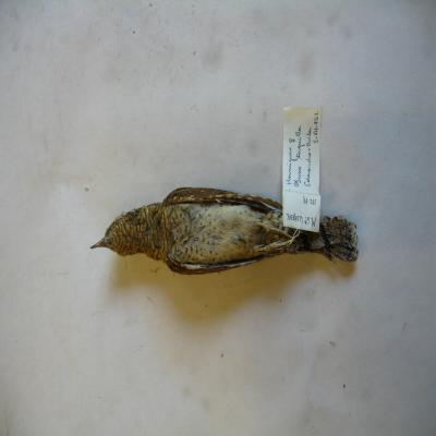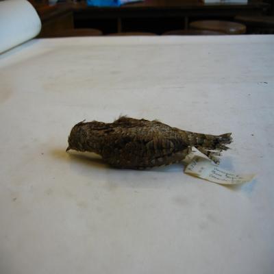 Dentro de una cajita con más aves. La caja tiene una etiqueta en la parte interior de la tapa con inscripción a bolígrafo: "Colegio de Calderón de la Barca. Felipe Garcia", y en la parte inferior de la caja otra con inscripción a máquina: "M. SANZ, NATURALISTA. MADRID. Justa, 7. 2º.". Posee otra etiqueta en la tapa, con inscripción a bolígrafo "CAJA AVES Nº1" El ejemplar tiene unida a una de las patas una etiqueta con inscripción a bolígrafo "M.Gª. LLORENS. Nº19. Hormiguero hembra. Junx torquilla. Solosancho?-Avila. 3-VII-921"