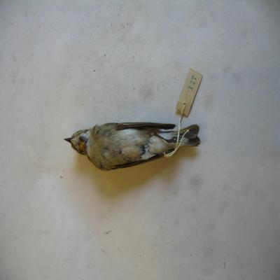 Dentro de una cajita con más aves. La caja tiene una etiqueta en la parte interior de la tapa con inscripción a bolígrafo: "Colegio de Calderón de la Barca. Felipe Garcia", y en la parte inferior de la caja otra con inscripción a máquina: "M. SANZ, NATURALISTA. MADRID. Justa, 7. 2º.". Posee otra etiqueta en la tapa, con inscripción a bolígrafo "CAJA AVES Nº1".