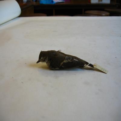 Un ejemplar disecado. Pico fino, ancho en la base. Cola rrelativamente corta. Cuerpo fino, delgado. Color pardo, con mancha clara alar. Pecho y vientre claros. Pico y patas negruzcos.