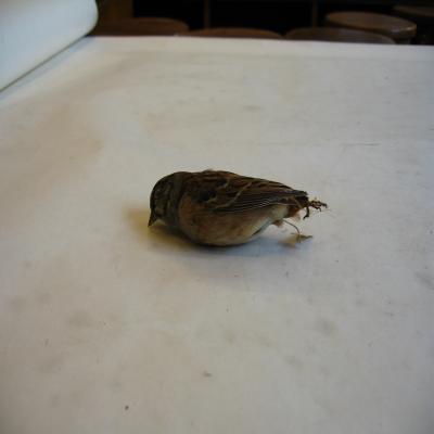Ave. Neognathae. Passeriformes. Fam. Emberizidae Un ejemplar disecado. Escribano delgado, le falta la cola y una pata, y la otra está bastante rota. Pico oscruro, fino y no muy largo. Patas claras. Dorso listado, color parduzco, con la zona de la cola rojiza. Cabeza con franjas, una a modo de antifaz negro. Cabeza, cuello y pecho grisáceos, mientras que el vientre es parduzco.
