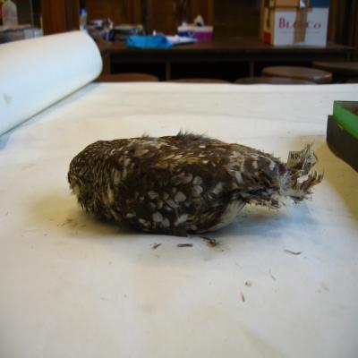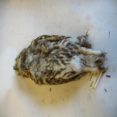 El ejemplar tiene unida a una de las patas una etiqueta con inscripción a bolígrafo: "M. Gª. LLORENS. Carina noctua. Macho. Mochuelo. 11.X.922. Villalba. Madrid".