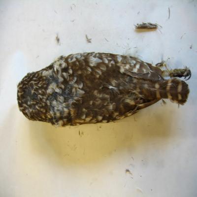 Un ejemplar disecado. Grande, con cabeza grande y cara aplanada, con los ojos dirigidos hacia delante.Pico ganchudo y garras poderosas. Patas largas. Parte superior marrón oscuro con moteado blanco apagado, y franjas blanquecinas en la cola y alas. Mejillas parduzcas, garganta blanca y ancha. Alrededor de los ojos también blanco.