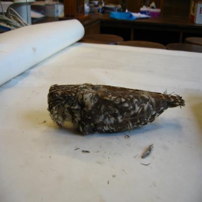 El ejemplar tiene unida a una de las patas una etiqueta con inscripción a bolígrafo: "Athene (Glaucidium) noctua. Mochuelo".