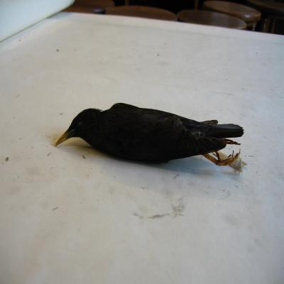 Un ejemplar disecado. Robusto, con pico largo y puntiagudo, amarillo al igual que las patas. Cabeza y cuerpo piriforme, alas puntiagudas y cola corta. Plumaje negro brillante. Patas fuertes.