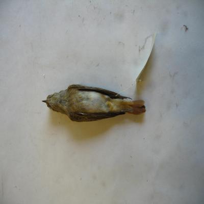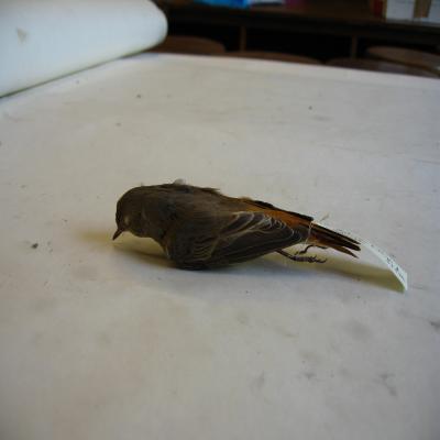 El ejemplar tiene unida a una de las patas una etiqueta con inscripción a bolígrafo "M.Gª. LLORENS. Ruticilla tithys. Hembra. Colirojo. 9.I.929. Madrid.".