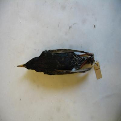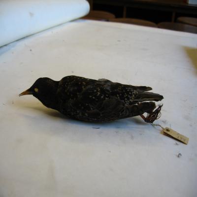 Un ejemplar disecado. Robusto, con pico largo y puntiagudo. Cabeza y cuerpo piriforme, alas puntiagudas y cola corta. Plumaje negruzco, lustrado de verde bronce y morado. Muy salpicado de blanco sucio y con el pico amarillo. Patas fuertes pardo-rojizas.
