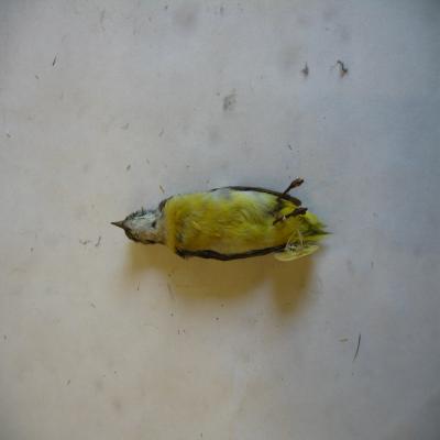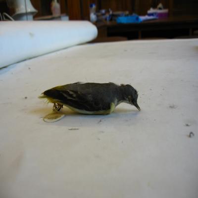 Un ejemplar disecado. Ejemplar pequeño, muy esbelto. Pico muy fino y algo largo, oscuro como las patas. Gris en el dorso y parte de las alas. Cuello y parte de las alas blanco y el vientre amarillo. Le falta la cola.