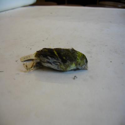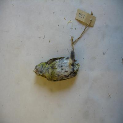 Un ejemplar disecado.Fringílido pequeño, de pico fino, batante regordete. Dorso grisáceo listado de amarillo, franjas amarillas en las alas, mejillas amarillo-verdosas, cabeza grisácea con los bordes de las plumas más claros. Ventralmente blanco con pitas grises y la zona del pecho algo amarilla. Le falta la cola, y una de las patas. La otra pata está casi desprendida.
