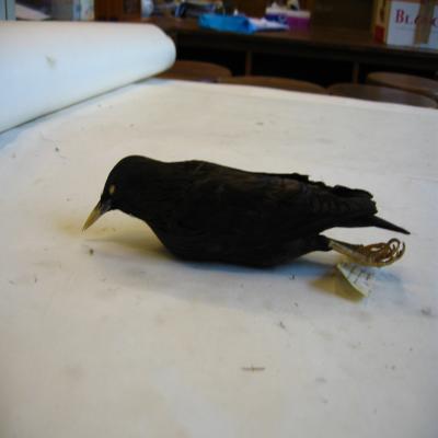 El ejemplar tiene unida a la pata una etiqueta con inscripción a bolígrafo "M.Gª.LLORENS. Nº15. Tordo macho. Sturnus unicolor. Paracuellos del jarama. Madrid. 9.IV.921".