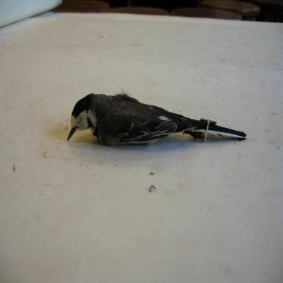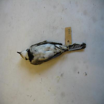 Un ejemplar disecado. Cuerpo esbelto, cola larga, alas cortas. Pico lago y fino, negro, como als patas. Coloración del dorso grisácea, con la nuca negra, pero la frente blanca. Mejillas blancas con una mancha negra. Cuello negro. Vientre blanco. Alas grisáceas con líneas transeversales blancas. Cola negra, con alguna pluma o borde de pluma blanco.