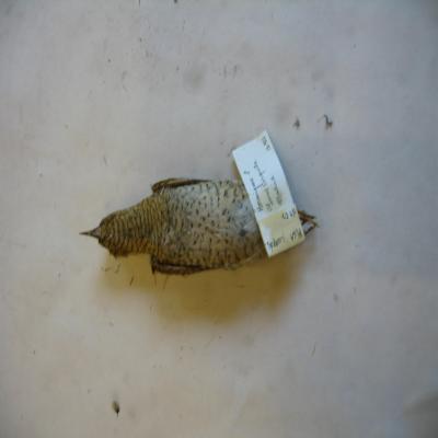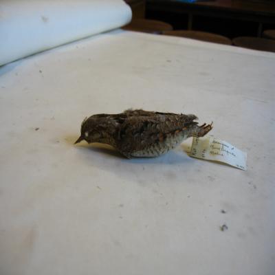 Un ejemplar disecado. Pico alargado y fino, ancho en la base. Patas poderosas. Ha perdido la cola. Color algo serpentiforme. Plumaje pardogrisáceo, con las partes inferiores más pálidas. Línea oscura desde el ojo hasta el lado del cuello, centro del dorso pardo-negruzco, alas ajedrezadas y barradas de oscuro. Partes inferiores onduladas.