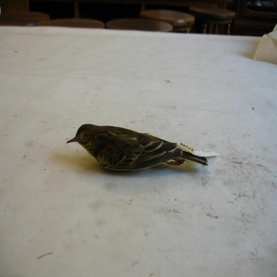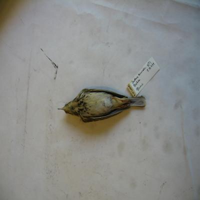 El ejemplar tiene unida a la pata una etiqueta con inscripción a bolígrafo "M.Gª.LLORENS. Anthus trivialis. Hembra?. 2.XI.922. Madrid.".