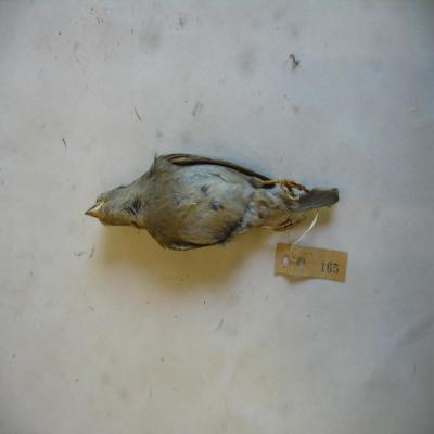 El ejemplar tiene unida a la pata una etiqueta con inscripción a lápiz "Passer domesticus", y el número "165" escrito a máquina.