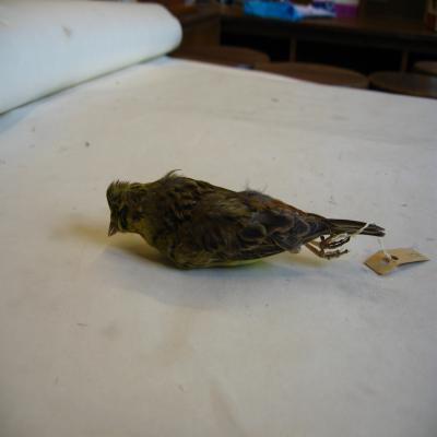 El ejemplar tiene unida a la pata una etiqueta con inscripción a lápiz "Emberiza citrinella", y el número "178" escrito a máquina.