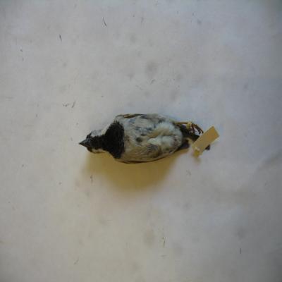 Un ejemplar disecado. Ave pequeña, rechoncha. Pico grueso, algo grisáceo. Pata amarilla (le falta una). Tiene coloración de macho, cabeza gris, nuca castaña, garganta y pecho negros y mejillas blancuzcas. Laterales de la cabeza marrones, al igual que el dorso, que es marrón-grisáceo moteado de más oscuro. Viente blanco-grisáceo.