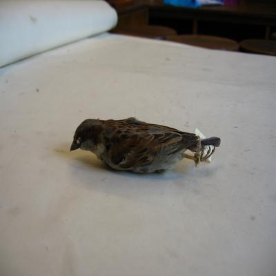 El ejemplar tiene unida a la pata una etiqueta con inscripción a lápiz "Passer domesticus".