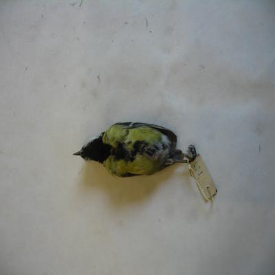 Un ejemplar disecado. Ave pequeña, con el pico grueso y corto, gris al igual que la pata (sólo conserva una). Coloración viva. Dorso verdoso en la parte superior, y grisáceo en la inferior, alas y cola. Cabeza negra, con mejillas triangulares blancas. "Babero" entero negro que se extiende hasta el centro del cuerpo. Ventralmente amarillo.