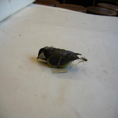 El ejemplar tiene unida a la pata una etiqueta con inscripción a lápiz "Parus major", y el número "145" escrito a máquina.