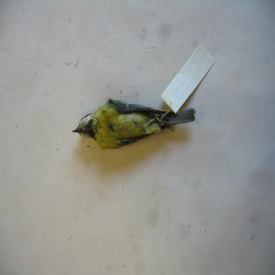 Un ejemplar disecado. Ave pequeña, fina. Pico corto y fino, oscuro, al igual que las patas. Parte superior azul-veroso, con la nuca blanca sucia. Franja alar blanca, cara blanca con antifaz azul oscuro. Cabeza azulada unida al collar del mismo color. Por abajo amarillo.