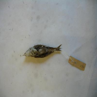 El ejemplar tiene unida a la pata una etiqueta con inscripción a lápiz "Certhia brachydactyla" y el número "179" escrito a máquina.