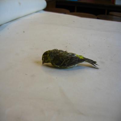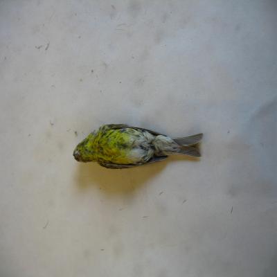 Un ejemplar disecado. Pajarillo pequeño, delgado. Pico corto, robusto, oscuro. Le faltan las patas. Dorsalemente pardo moteado de amarillo, cabeza muy moteada. Inicio de la cola amarillo. Banda amarilla sobre el ojo y bajo la mejilla, que se unen. Alas con dos bandas transversales amarillas. Garganta y pecho amarillos, moteado de marrón en los lados. Vientre blanco. Cola horquillada.
