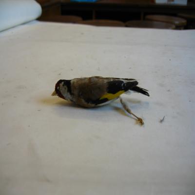 Un ejemplar disecado. Ejemplar mediano, esbelto, de pico fino de color claro y cola hendida. Pata de color claro (le falta la otra, y la que tiene está a punto de desprenderse). Coloración muy decorada, con cabeza escarlata, blanca (mejillas) y negra (alrededroe del pico), alas negras en las que hay un largo panel amarillo vivo, y cola negra. Dorsalemente pardo. Garganta blanca, pecho pardo y vientre blanco.