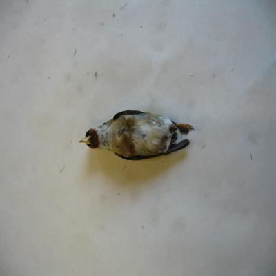 Un ejemplar disecado. Ejemplar mediano, esbelto, de pico fino de color claro y cola hendida. Pata de color claro (le falta una pata). Coloración muy decorada, con cabeza escarlata, blanca (mejillas) y negra (alrededroe del pico), alas negras en las que hay un largo panel amarillo vivo, y cola negra. Dorsalemente pardo. Garganta blanca, pecho pardo y vientre blanco.