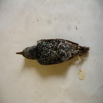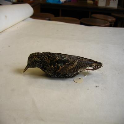 Un ejemplar disecado. Robusto, con pico largo y puntiagudo. Cabeza y cuerpo piriforme, alas puntiagudas y cola corta. Plumaje negruzco, lustrado de verde bronce y morado. Muy salpicado de blanco y con el pico oscuro (características de invierno). Patas fuertes pardo oscuro.