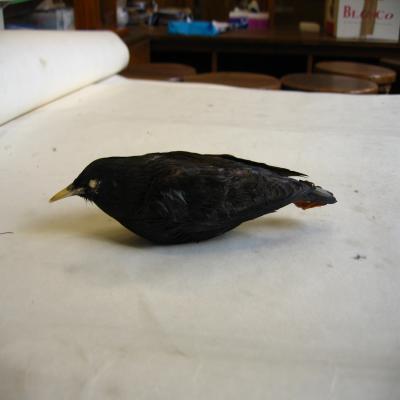 Un ejemplar disecado. Robusto, con pico largo y puntiagudo, amarillo al igual que las patas. Cabeza y cuerpo piriforme, alas puntiagudas y cola corta. Plumaje negro brillante. Patas fuertes.