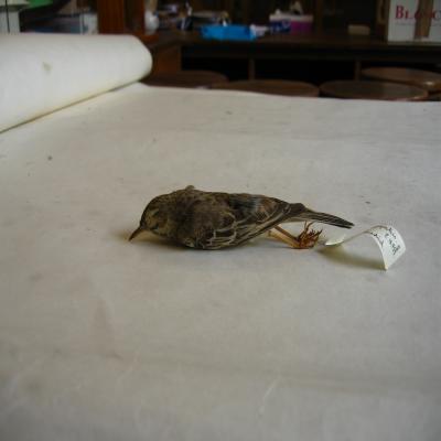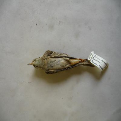 El ejemplar lleva unida una etiqueta con inscripción a bolígrafo "M.GªLLORENS. Anthus campestris. Hembra. Calandrina. 2.IX.929. Barajas. Madrid"