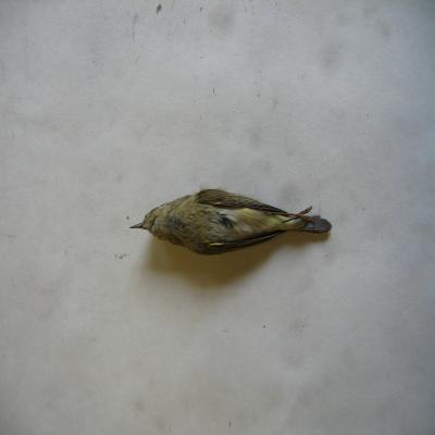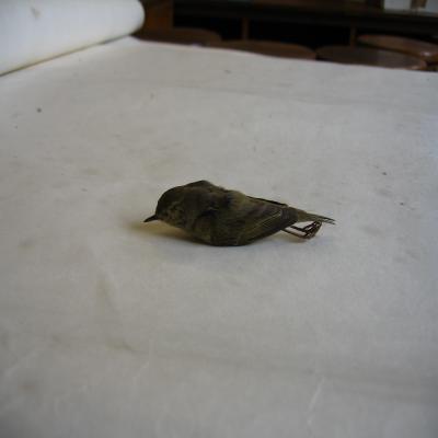 Un ejemplar disecado. Ave muy pequeña, esbelta, con pico largo y fino, oscuro, al igual que las patas. Por arriba pardo-verdoso, con el borde de las plumas de las alas y cola amarillas, y una mancha amarilla en la última pluma alar. Mancha de color claro sobre los ojos. Ventralmente claro y liso.