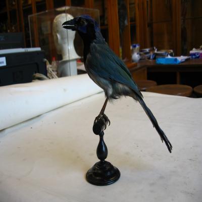 Un ejemplar naturalizado. Postura de reposo. Similar a un córvido, mediano, con pico fuerte y ancho, negro. Cola larga. Patas oscuras. Coloración dorsal verde, con la nuca azul, y la cola con plumas azuladas y claro. Sobre el pico azul, y después la frente azul-grisácea. Alrededor de los ojos negro, que se une con el cuello y pecho. Mejillas azules. Vientre blanco-azulado.