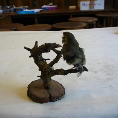 Un ejemplar naturalizado sobre ramas de un árbol. Muy mal conservado. Túrido bastante pequeño, regordete, de cabeza redonda y "sin cuello". Pardo-oliváceo por encima y blanquecino por debajo, con parte anterior de la cara y pecho anaranjado-rojizos, ribeteados de gris. No conserva el pico, y muy mal las patas.