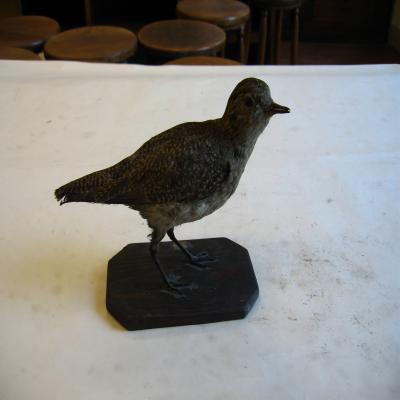 -Una pequeña blanca, unida a la parte superior, con inscripción a bolígrafo: "Pluvialis apricaria (Chorlito dorado común)".