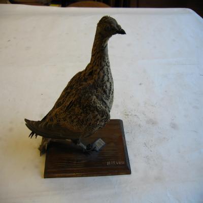 Un ejemplar naturalizado. Voluminosa, corpulenta. Cuello largo. Pico corto, algo inclinado hacia abajo, de color negro al igual que las patas. Coloración dorsal parda con ondulaciones negras. Alas largas de color grisáceo, con la parte anterior ocre. No conserva la cola. Cuello algo anaranjado, con franja negra arriba y abajo del pecho, este punteado de negro. La primera parte del vientre clara, y el resto negro. Parte basal inicial de la cola clara.