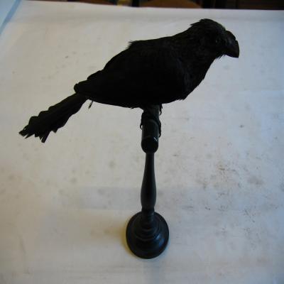 Un ejemplar naturalizado. Mediano, con cola bastante larga. Pico robusto, no muy largo, con una especie de quilla superior, color negro al igual que las patas. Cabeza y nuca grisáceos, el resto del cuerpo negro. Dorsalmente plumas con borde grisáceo. Pecho moteado de gris.