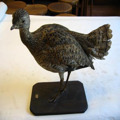 Un ejemplar naturalizado. Ave terrestre grande, robusta, de cabeza pequeña, cuello recto y patas bastante largas. Pico corto y robusto, color algo oscuro al igual que las patas. Coloración amarillo-arenoso con manchas pardo oscuras por toda la superficie. Cola de color claro, con franjas pardas y machitas también pardas, dispuesta a modo de abanico. Las plumas más externas de las alas pardas con zonas claras. Cuello blanco, pecho del mismo color que el dorso pero moteado de color claro. Vientre blanco.