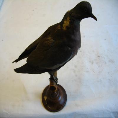 Une ejemplar naturalizado. Grande, robusta, de cabeza pequeña, cuerpo largo y grueso, alas anchas. Le falta la cola. Pico alargado, no muy ancho, oscuro al igual que las patas. Muestra una clara franja blanca muy marcada que le atraviesa el centro del ala y manchas blancas por debajo de la marca verde-púrpura brillante del cuello, ambas notables por encima del hondo pecho color vino. Dorsalmente es gris, con el borde externo de las plumas de las alas blanco. Vientre blanco sucio.