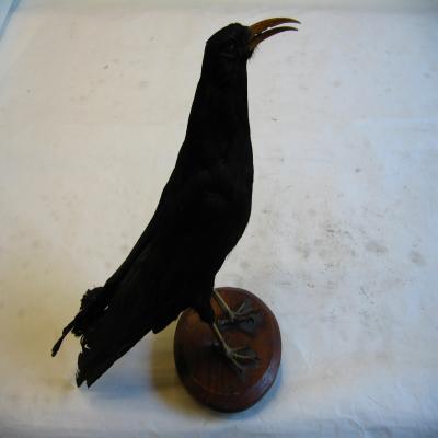 Un ejemplar naturalizado. Tamaño grande, con largo y fino pico curvado, de color amarillo al igual que las patas. Alas largas. Plumaje negro, ligeramente tornasolado de azul.