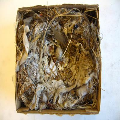 Nido de ave formado por una aglomeración de pajas y restos vegetales, restos de cordones, hilos y telas y plumas principalemente. En su interior hay restos de lo que parecen tres huevos rotos, y uno entero. Son huevos pequeños, de coloración blanco sucio moteado de gris. En los rotos se observan restos de lo que posiblemente sean embriones.