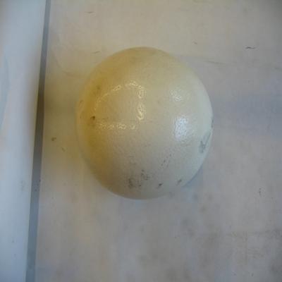 Huevo de ave de grandes proporciones, de superficie rugosa. Color marfil. Tiene dos agujeros en uno de los extremos.