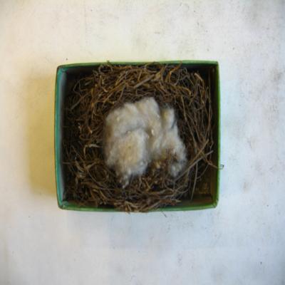 Nido de ave, no muy grande, formado por ramitas y pajitas secas entrelazadas. En el centro un poco de algodón. No hay ningún huevo.